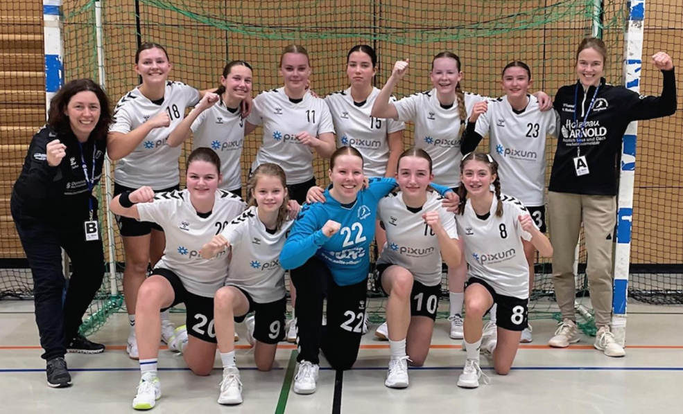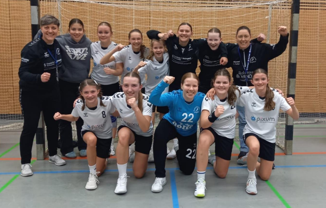 Das zweite Auswärtsspiel der Saison bestritt die weibliche C-Jugend am Samstag gegen die Mannschaft der HSG Volkach. Zur Halbzeit stand es zwar deutlich 11:5 für die Bergtheimerinnen, die erste Spielhälfte war jedoch von Unkonzentriertheit und individuellen Fehlern geprägt. Ein sehr eigenwilliger Ball trug immer wieder dazu bei, dass durch leichte Ballverluste die HSV-Mädels sich nicht deutlich absetzen konnten. Am Spielende holten sie die zwei Punkte mit dem Endstand von 20:12 nach Bergtheim. Auch hier gilt, dass solche Spiele erstmal am Ende so deutlich gewonnen werden müssen, was ebenfalls für die Leistungsfähigkeit und Mannschaftsstärke unserer C-Jugend spricht. (at)